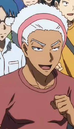 Harimoto appears with tanned skin and white hair pulled back by a pink hairband, with thick white eyebrows. He has a mole under his right eye.